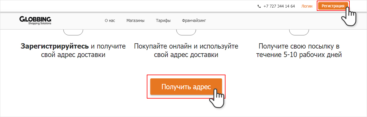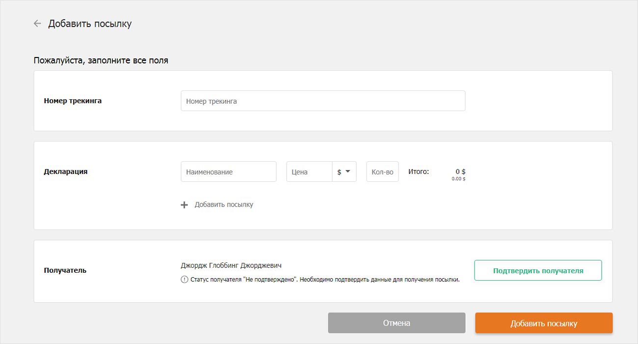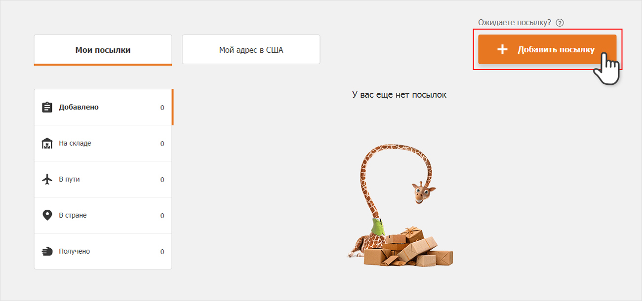 Этот номер необходимо будет ввести на странице оформления посылки на вашей Globbing-странице. Для этого необходимо нажать на кнопку «Добавить посылку»: